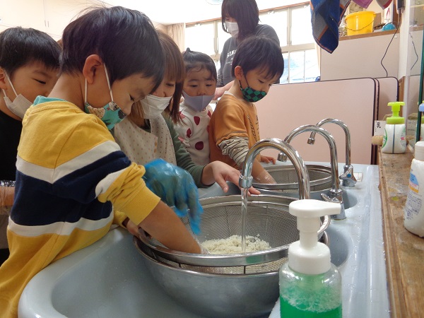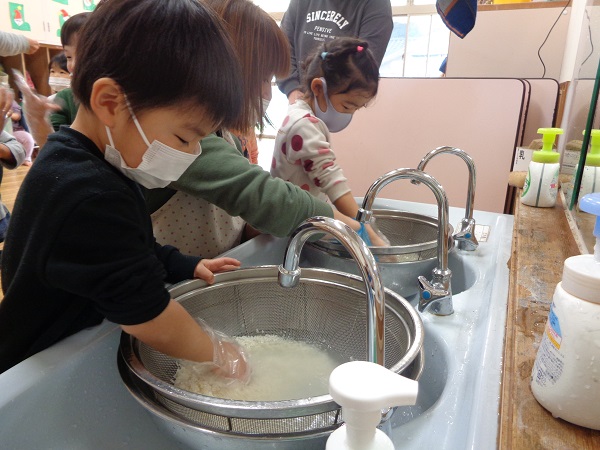 綺麗に手を洗ってマスクを付けたら、初めての米研ぎに挑戦✨