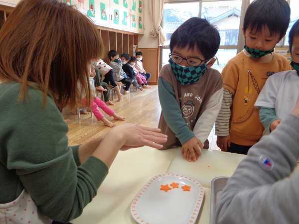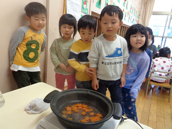 型抜いた人参を湯がく様子を見て「ダンスしてるみたい♡」と面白い発見もありました♪