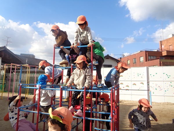ジャングルジムでは怖がることなく上まで登る事が出来る子がほとんどです☺♪