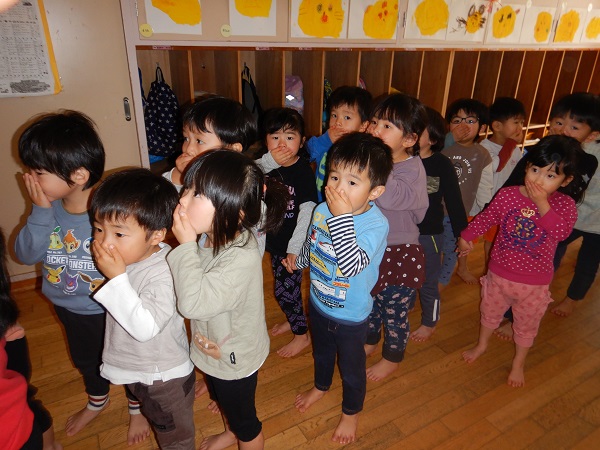 みんな静かに保育者の周りに集まり、さっと避難場所に集まる事が出来ましたよ。