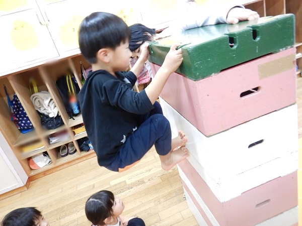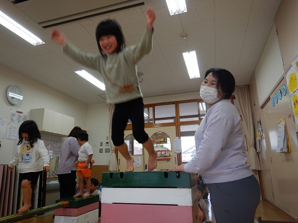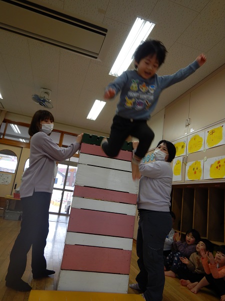 何度も挑戦していくうちに登れる段数が増え、最高で14段を飛ぶことが出来たお友だちも✨