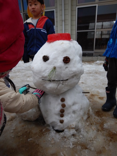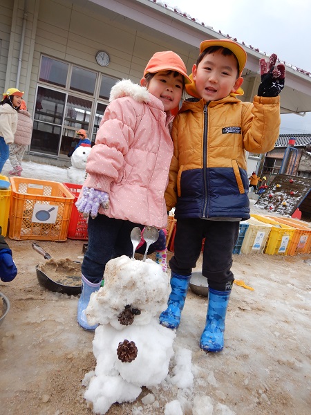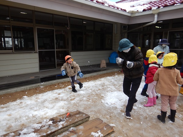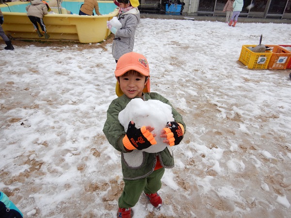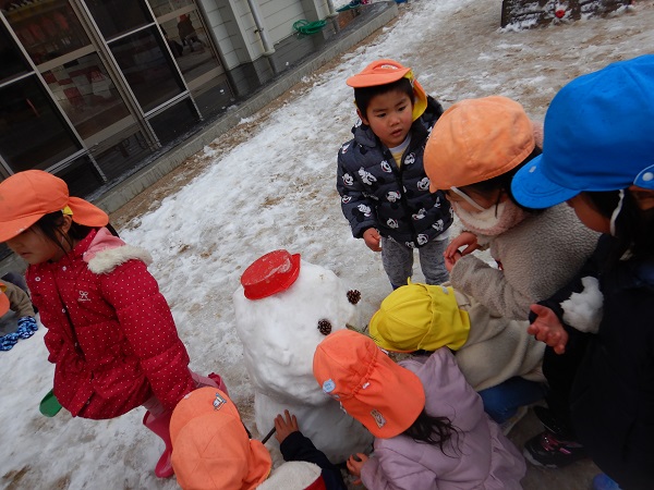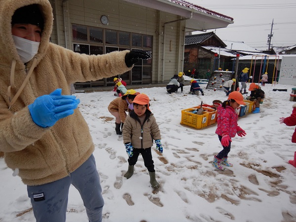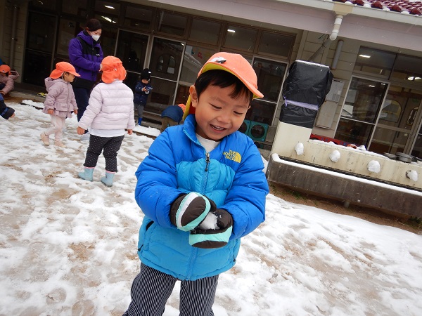 朝、園庭に積もった真っ白な雪を見て大喜びのばす組さん✨