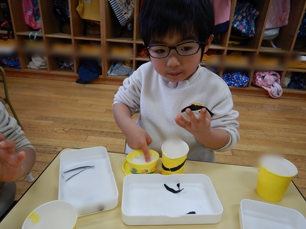 折り紙をながーく手でちぎり、昨日絵の具で色を塗った紙コップにちぎった折り紙を貼っていきましたよ☺
