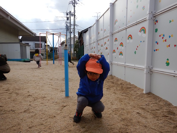 鬼に捕まった人はたこ焼きに変身✨手を頭の上にのせて、たこ焼きのように丸まってしゃがみます。