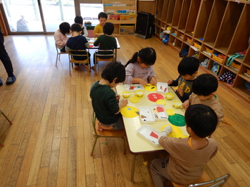 眉毛を貼る時に「怖い顔にする」と上向きに貼る子や「困った顔がいい」と下げて貼る子、口の向きはどうしようかなぁと考えながらがら、楽しんで作ることが出来ていました。