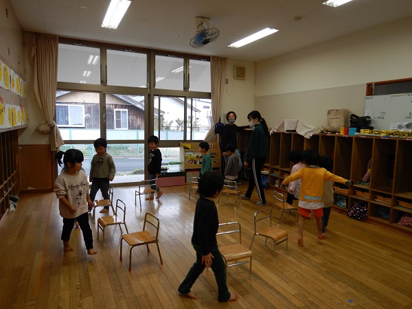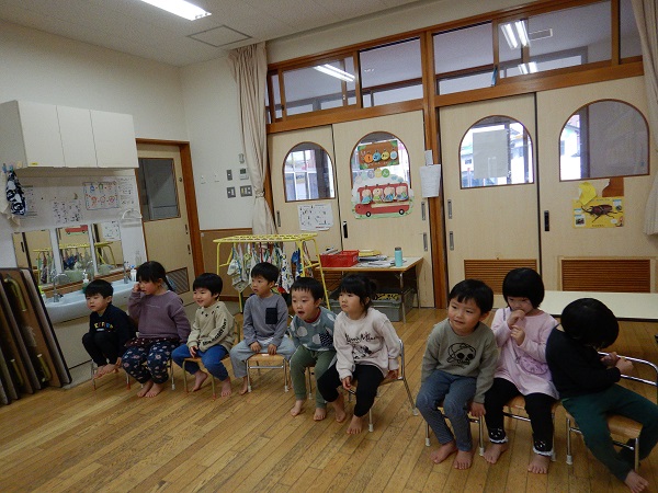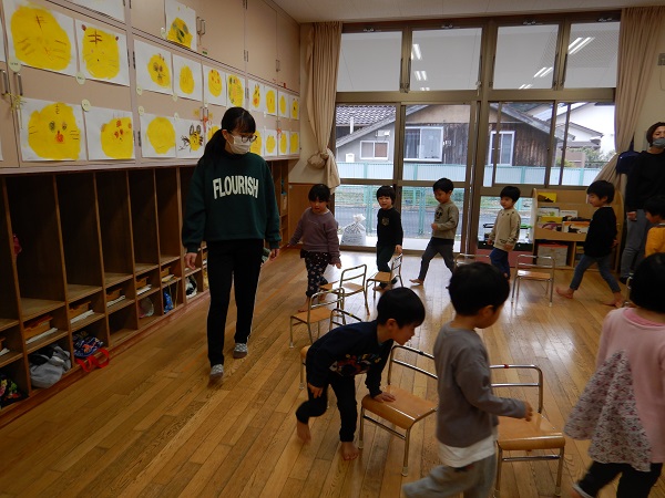 2022年01月21日 イス取りゲーム☆イス取りゲームをしました☆耳でしっかり音楽を聴いて、素早く座ることが出来ましたよ!イスに座れなくて涙が出るお友だちもいましたが、「次は頑張る!!」と自分で気持ちを切り替えることもできました☺みんなの大好きなイス取りゲーム☆またしようね!!