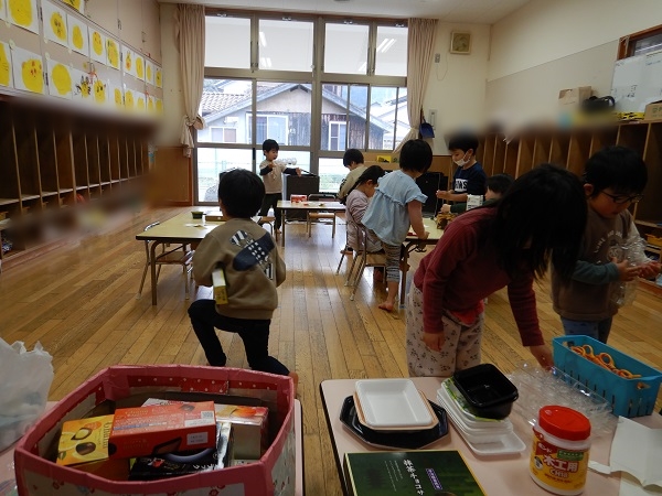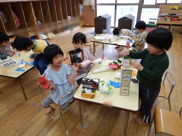 身体を動かして遊んだ後は、廃材を使って創作をしました✂