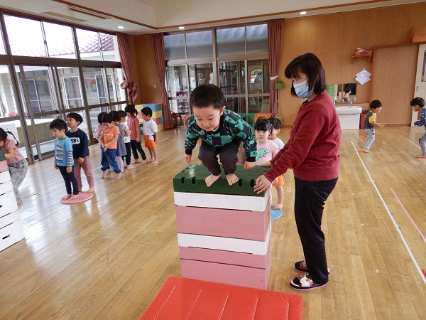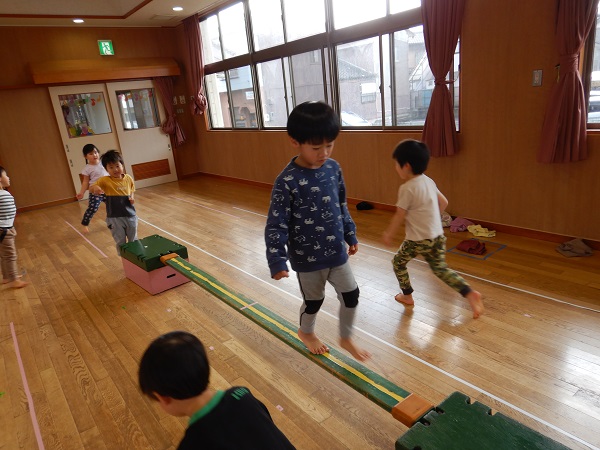 お楽しみ会の練習では、セリフの復習と巧技台、一本橋の練習をしました。