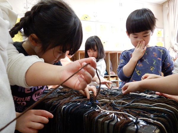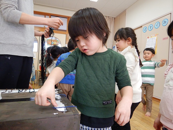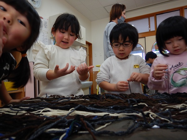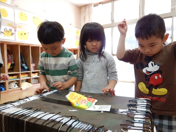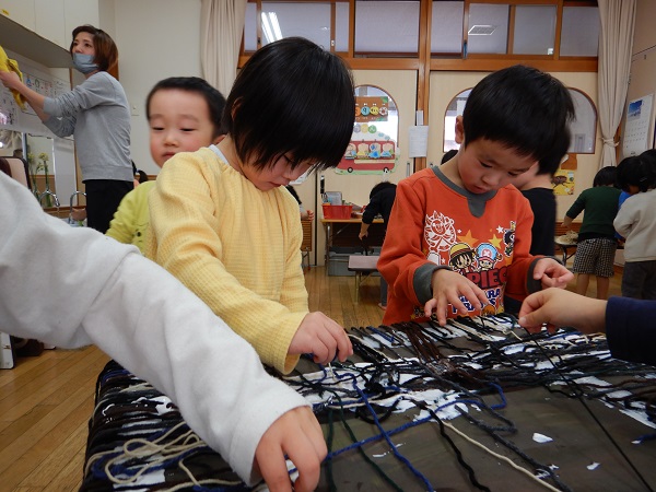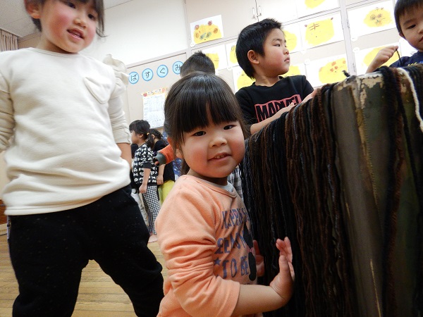 2022年02月09日 トロルを作ったよ!!お楽しみ会の「がらがらどん」の劇に登場するトロルを作りました■先日、絵の具を塗ったダンボールに毛糸で髪の毛を付けていきます!トロルはモジャモジャ頭だからたくさん髪の毛を付けなきゃ!!みんなで力を合わせて1本1本付けていきました✨怖~いトロルですが、みんなで作ったと思うと何だか愛着が湧いてきますね♡あとはぐりぐり目玉に長い鼻、大きな口を作ったら完成です!!