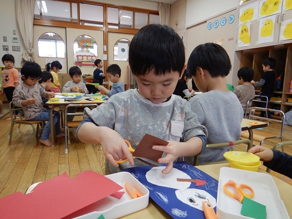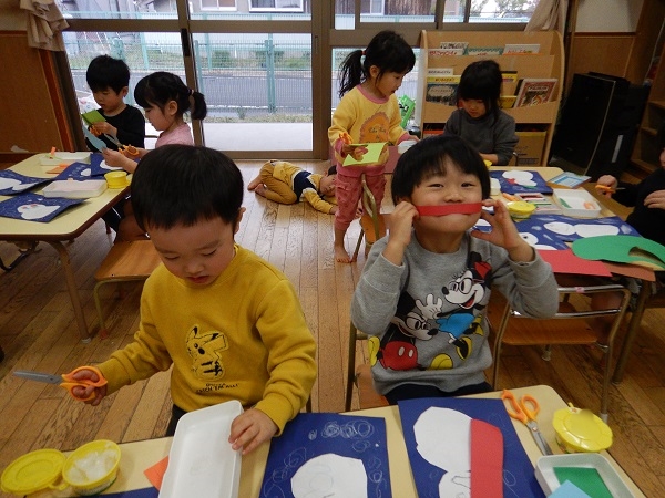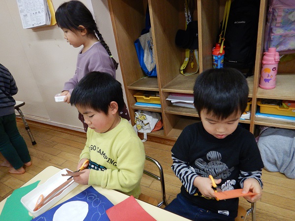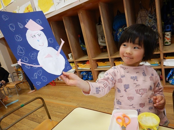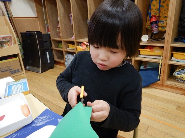まだ、イメージした通りの形に切ることは難しいですが、「三角の帽子ができたよ!」「手が長くなっちゃった(笑)」と楽しみながら作ることができました♡