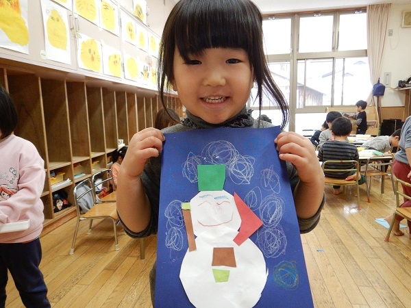 画用紙を自由に切って帽子や手袋、ボタンを作っておしゃれな雪だるまを作りますよ✂