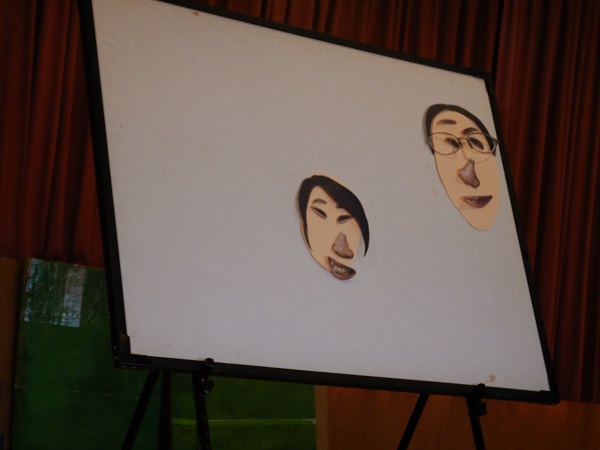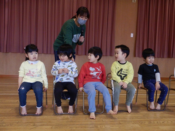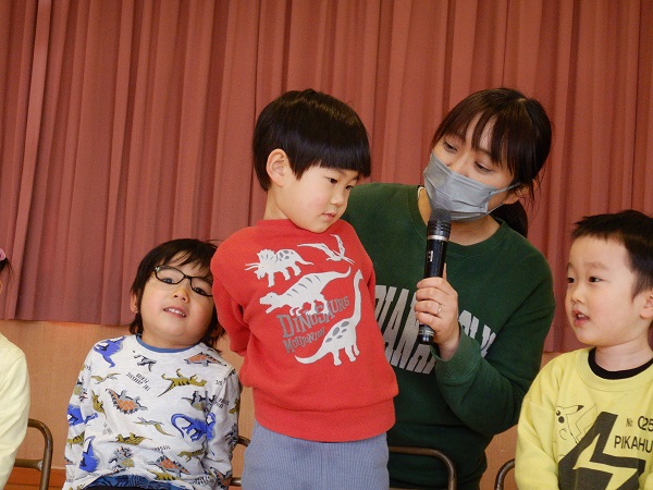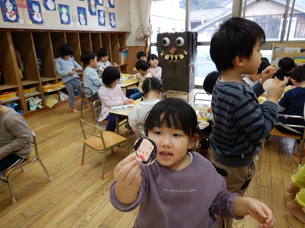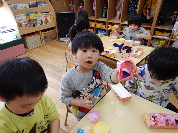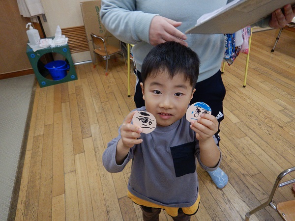 お楽しみの時間は、ろけっと組の誕生児さんが先生の顔の福笑いに挑戦しましたよ■
