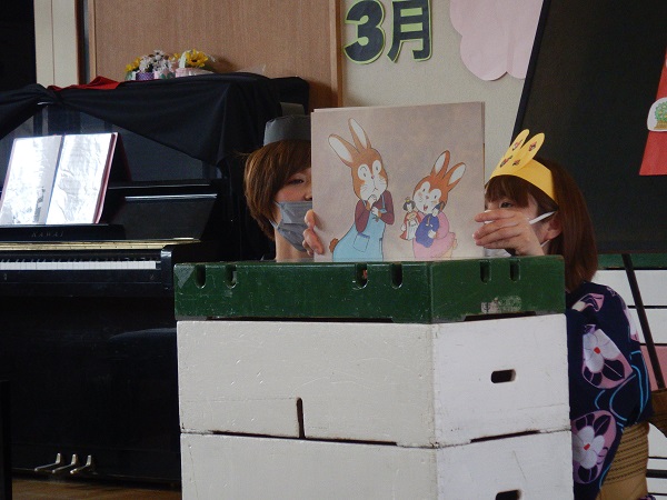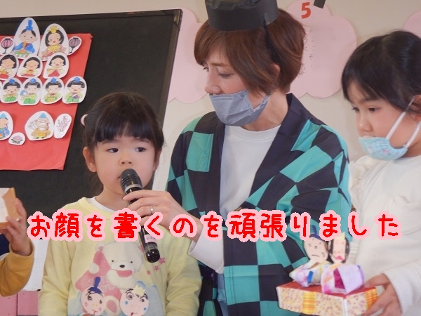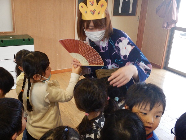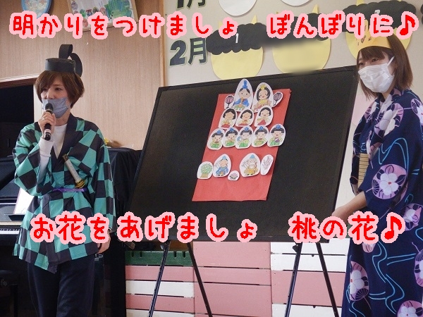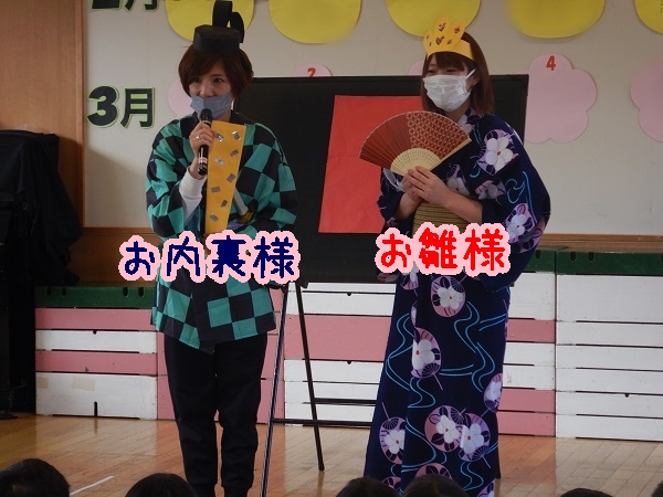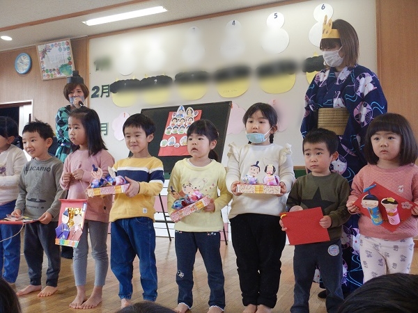 三人官女や五人囃子、左大臣、右大臣は何をする人なのか、雛人形をなぜ飾るのか等、話しを聞いたり紙芝居を見たりして知ることができました■