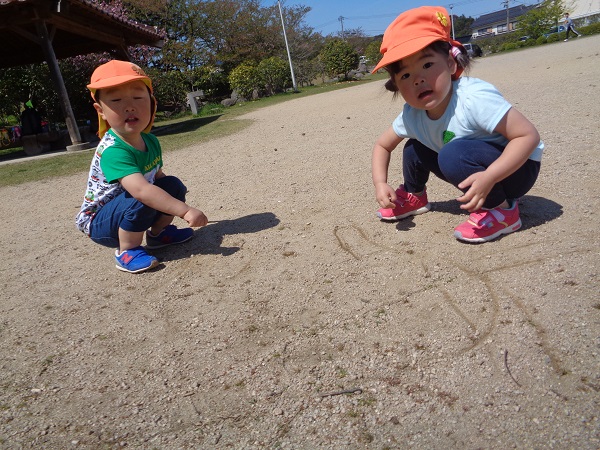 こちらでは地面にお絵描きが始まりましたよ♪