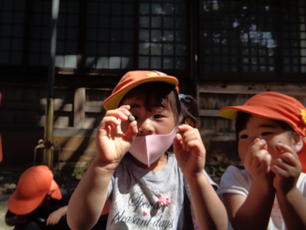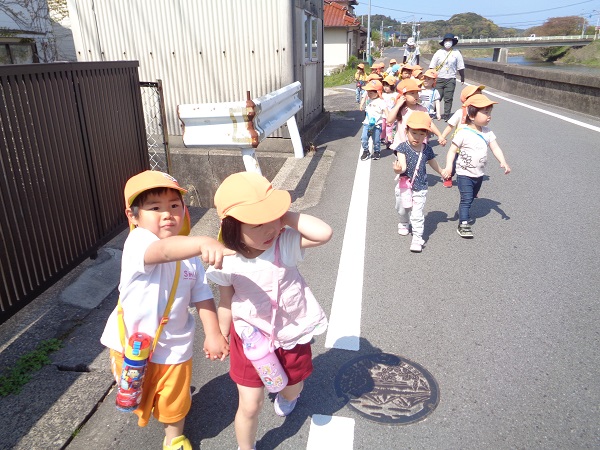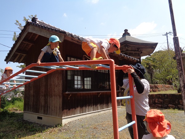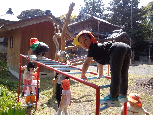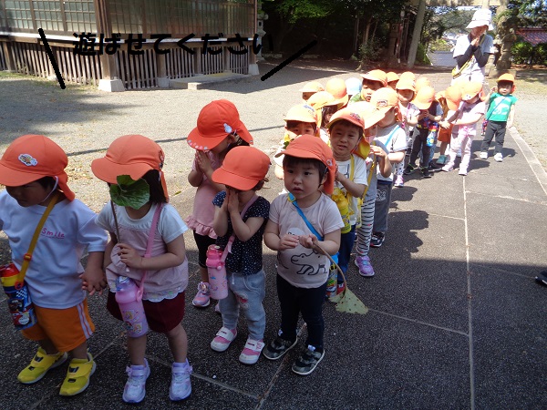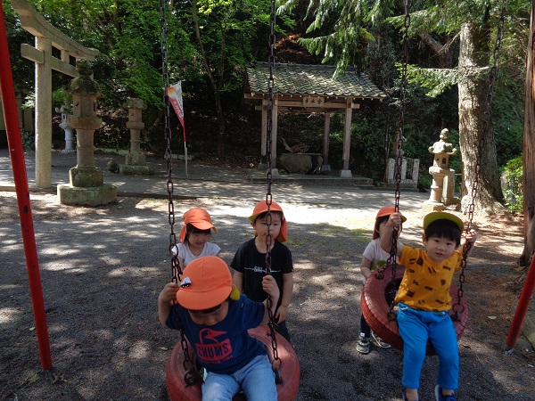 お散歩に行きました■「ブランコがあって、鉄棒があって、神様がいるところに行くよ~」と言うと、「南の宮~」と正解した子が何人かいましたよ■