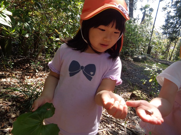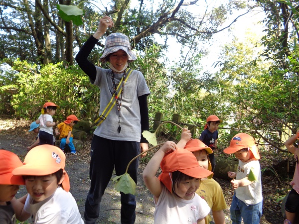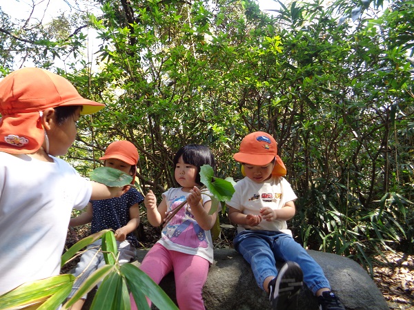「トトロの葉っぱ~」とばす組さんの大好きなフキの葉っぱをたくさん集めて「角だよ~」と頭に乗せて楽しんでいました✨