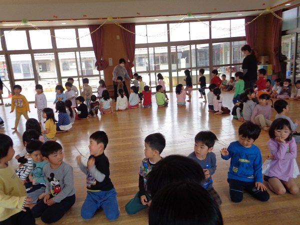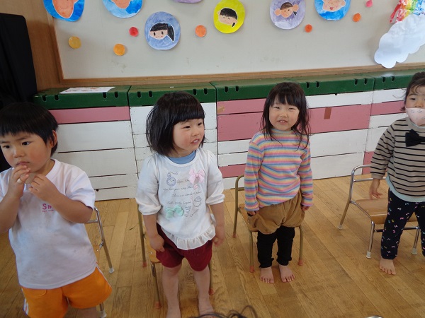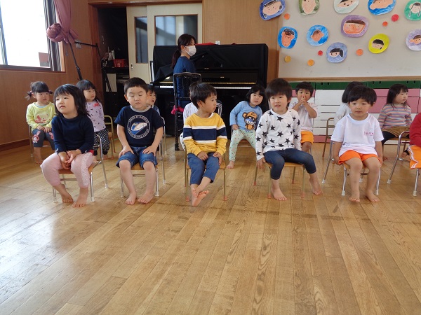 幼児組に仲間入りしたばす組さんと、新入園児さんを迎えるなかよし集会がありました。