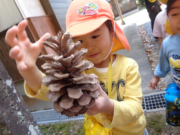境内の周りを散策していると、大きな松ぼっくりを見つけましたよ!
