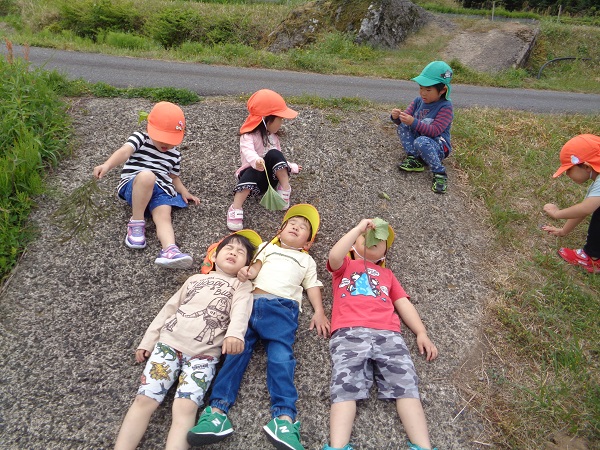 坂道を見つけ、「一緒に寝よ~」と声をかけ合い、お友だちと寝転がり楽しんでいました♬
