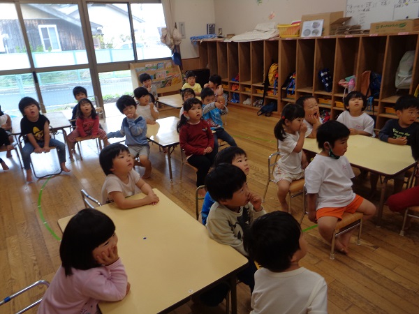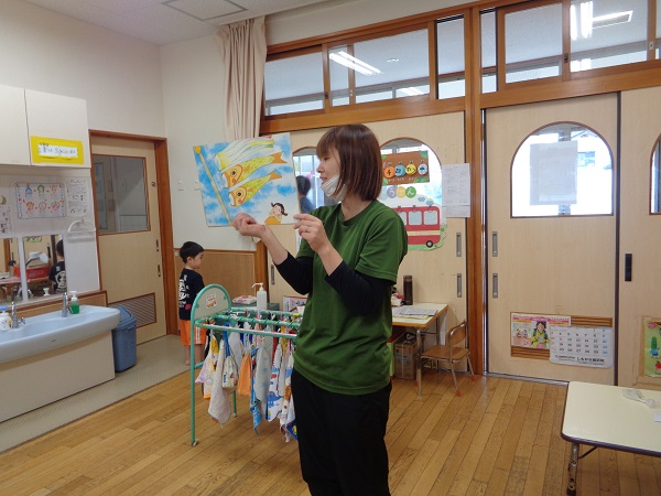 まずはこいのぼりの紙芝居を見て、製作への意欲を高めます♡