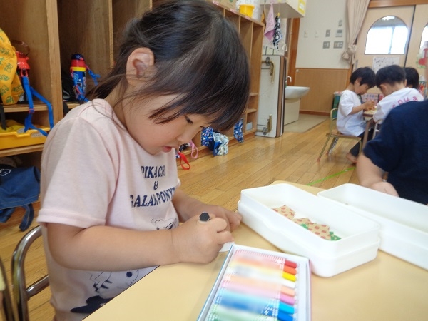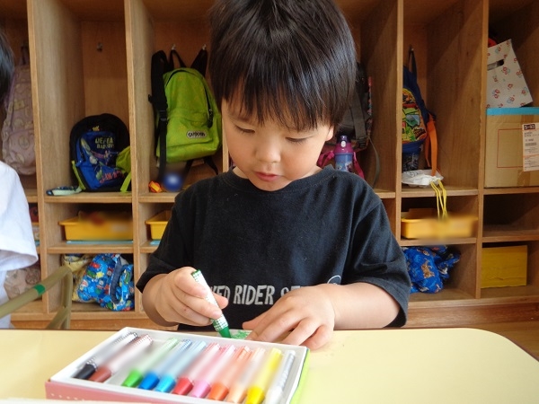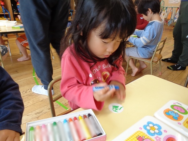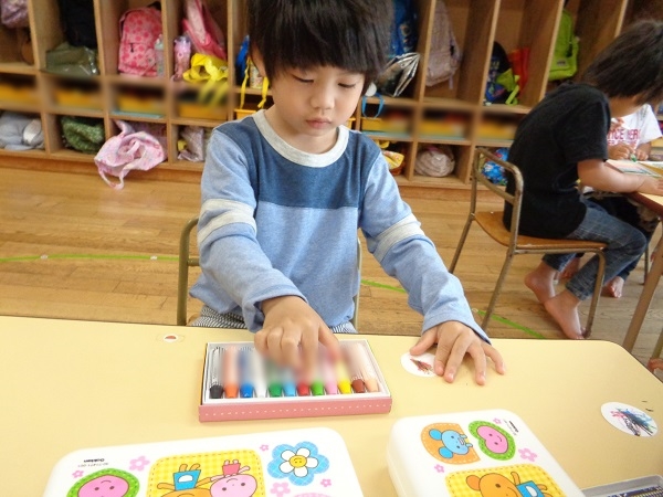 自分のお道具箱からクレヨンを取って、目を描きます✐