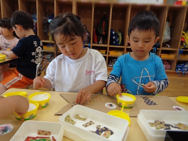 次は、こいのぼりの形をした台紙に、目と鱗を貼っていきます。