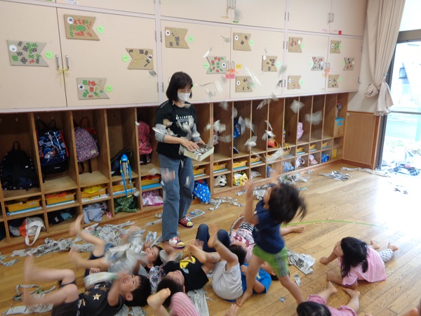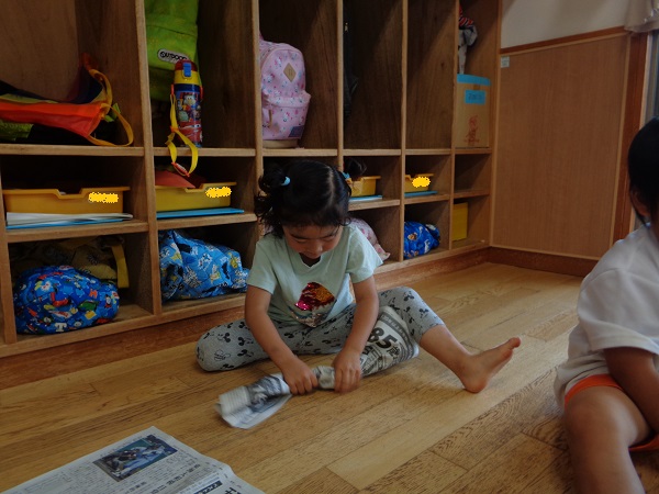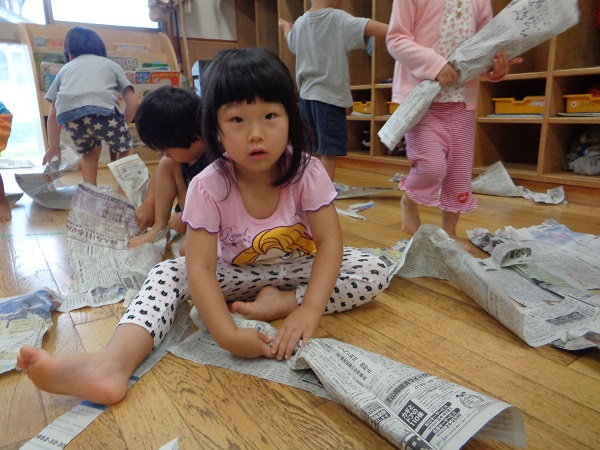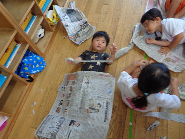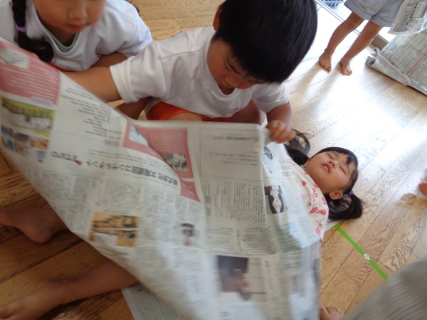 「お布団かけてあげるね♡」と、寝転んでいるお友だちにそーっと新聞紙をかけてあげる子も■