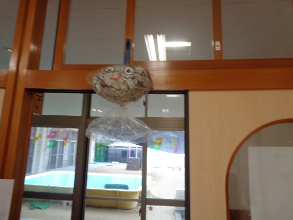 みんなが遊んだ新聞紙で『てるてる坊主』が完成しましたよ☂