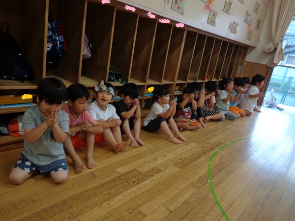 「てるてる坊主てる坊主♪明日天気にしておくれ~♬」とみんなで歌を歌い、明日は晴れますように...とお願いをしました。