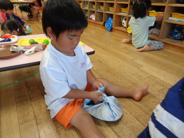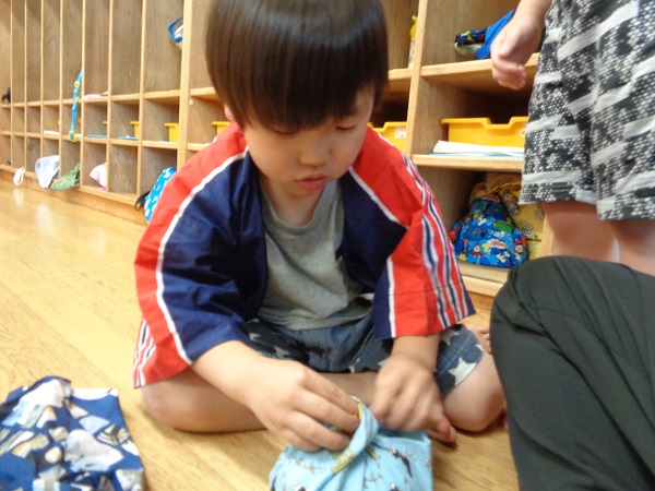 「先生結んで~」と保育者が結ぶこともありますが、自分でやってみると頑張って結んでいる姿も見られましたよ☺