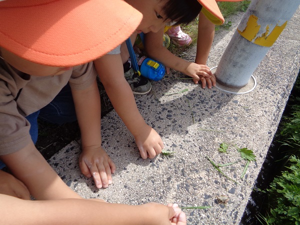 道端でお茶を飲んで休憩していると、さっそく何か見つけたようです!
