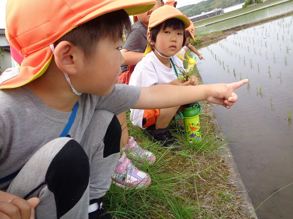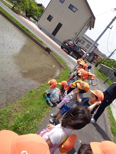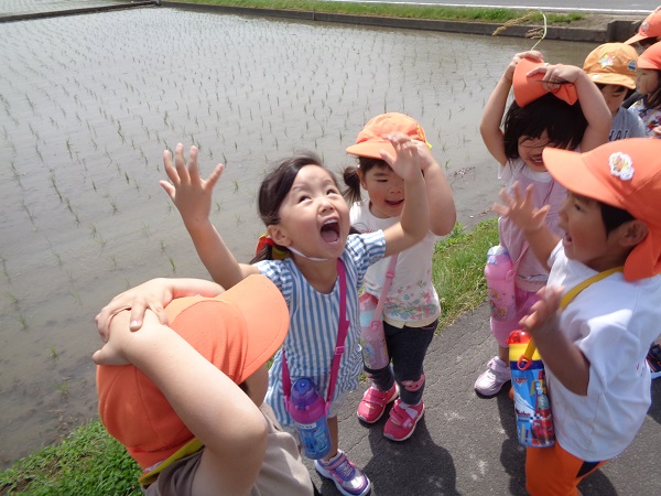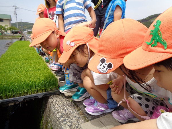 田植えが終わった田んぼには、アメンボや小さなオタマジャクシがたくさんいてみんな興味津々!!