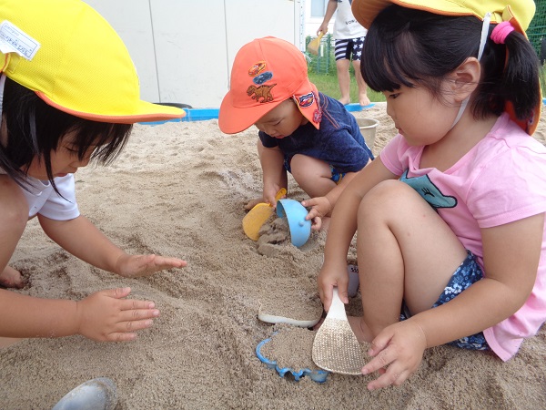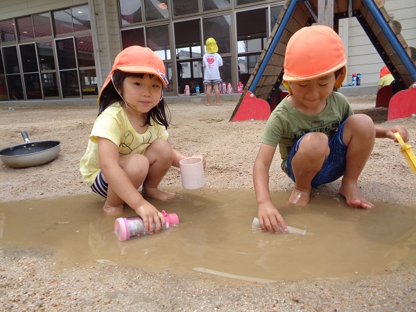 保育者が「水遊びをしますよ」と話すと...やった~の歓声が響き渡ります。園庭にレッツゴー