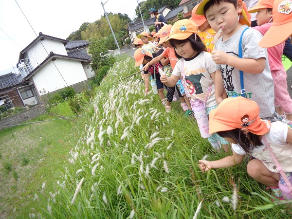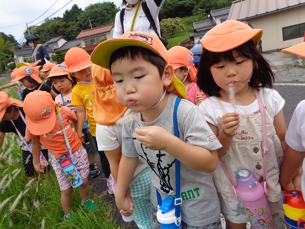 風に揺れるチガヤを見て、「フワフワで気持ちよさそう♡」とばす組さん。