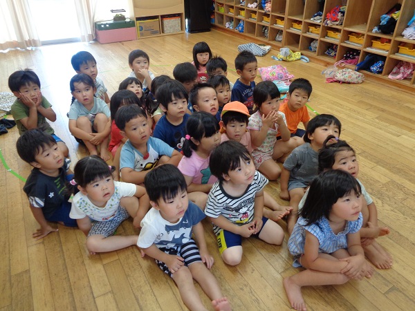 自然災害の恐ろしさや、災害が起きた時は保育者やお家の方の話をよく聞いて、一緒に安全な場所に避難することなどのお話をしました。みんな真剣に聞いてくれていましたよ。