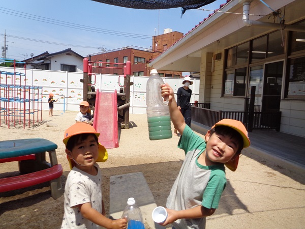 お当番さんに絵の具を入れたペットボトルをフリフリと振ってもらい、赤・白・青・黄色の色水を作りましたよ✨