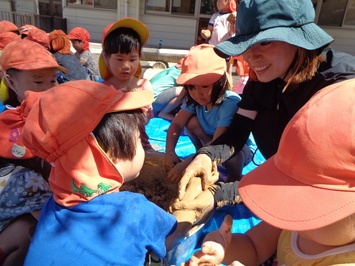 「気持ちがいいね~」「柔らかいね」と、お友だちと話しながら初めて触る赤土の感触を楽しんでいましたよ☺
