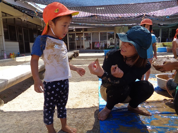 乾いていたら固く粘土のようで、水を混ぜれば柔らかくなるといった特性も、触って楽しむうちに自然と学ぶことが出来ていました✨