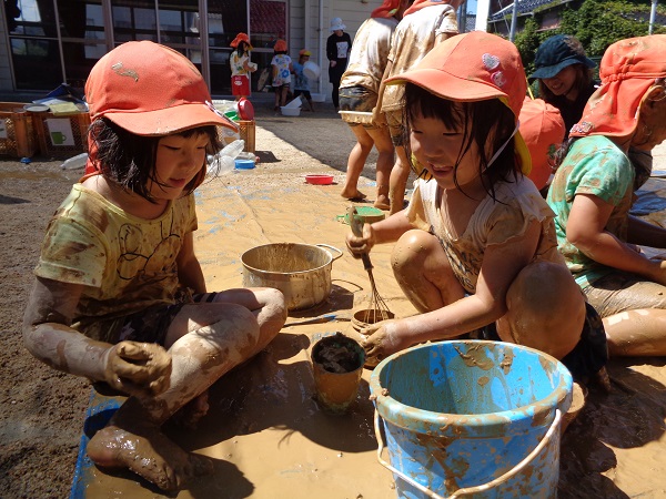 どんな形を作ろうかな、どれくらい水を加えたらトロトロになるんだろう...と想像力も豊かになり、また夢中になって遊ぶことで集中力も育まれます✨夏ならではの素敵な遊びですね■