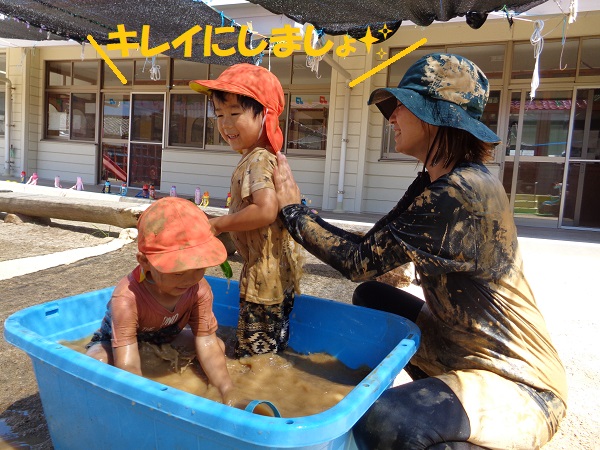 泥だらけになった後は、タライのお風呂に入り綺麗にしました❤