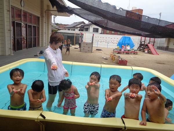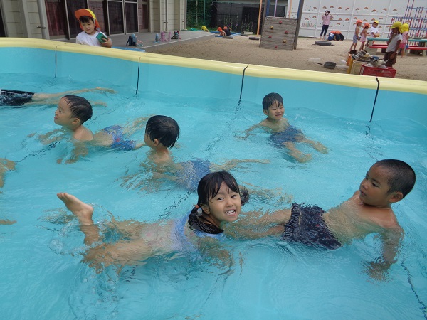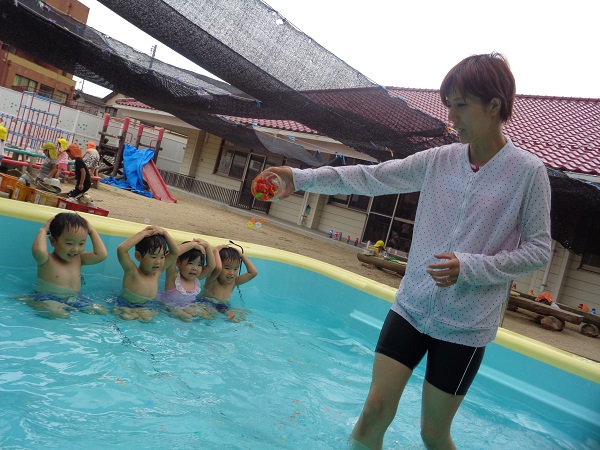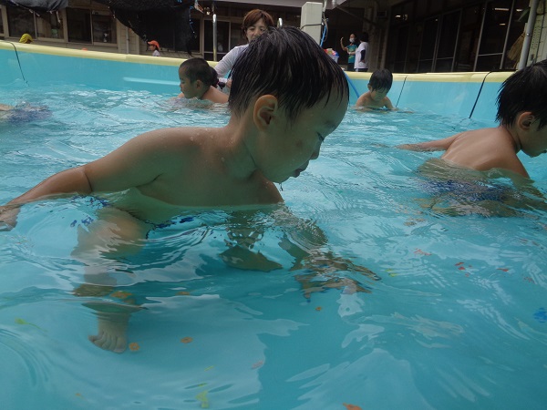 みんなでプールの中を「いち、に、いち、に」元気に歩きます■