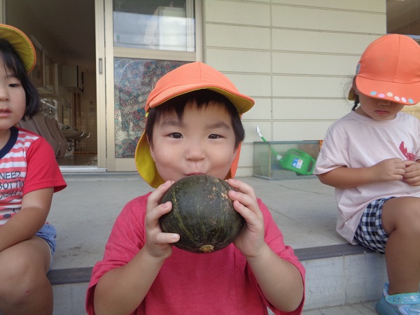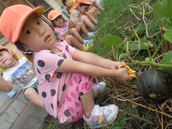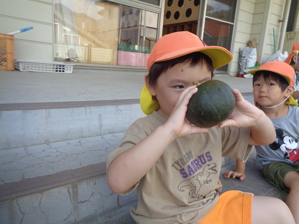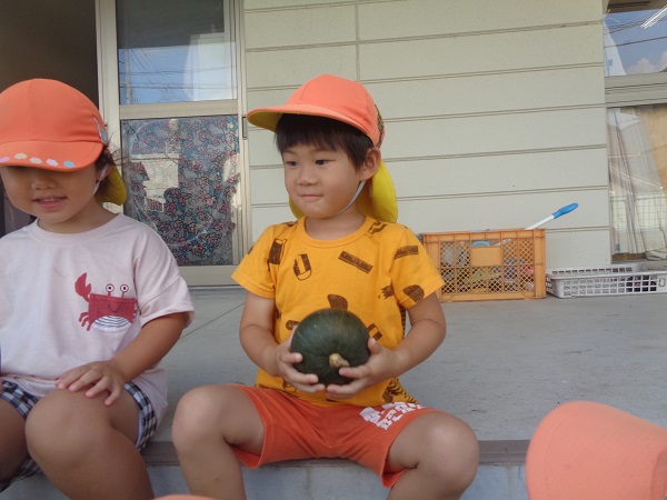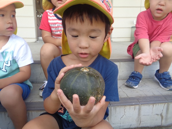 ばす組さんが育てている夏野菜のカボチャを初収穫しましたよ■