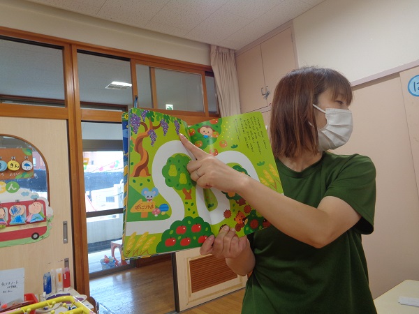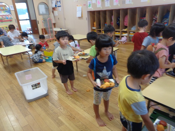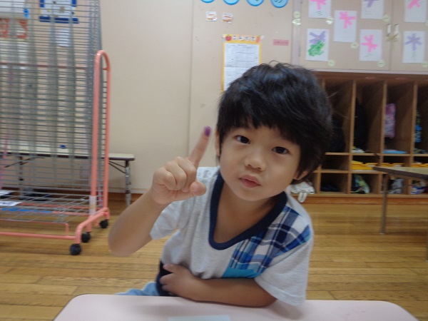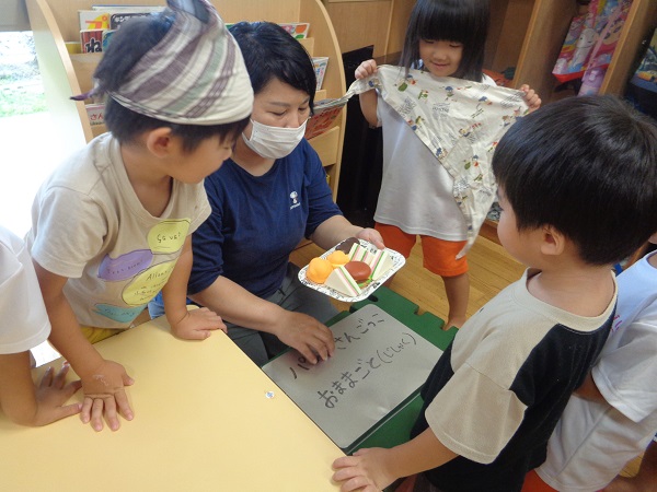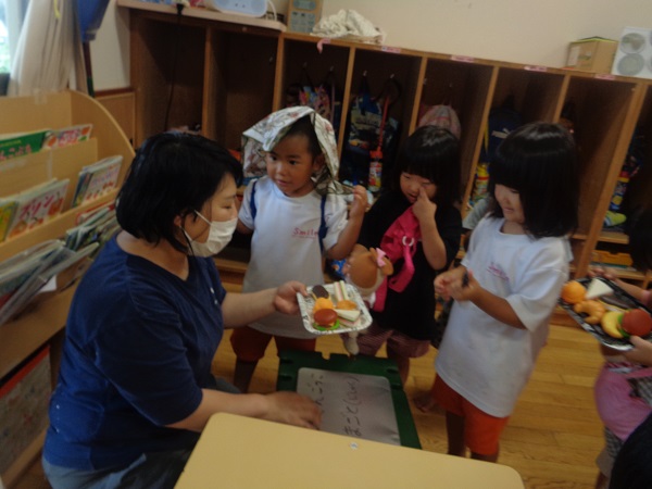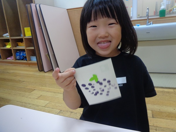 「紫色で皮を剥いて食べるものを作るよ~」というと、「紫色で..」と言ったところで「分かったぁ!ブドウ」とすぐに答えていました■