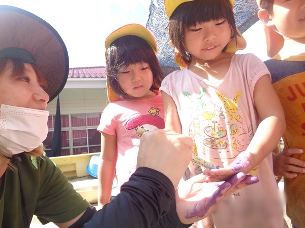 「手に塗っていきますよ~」と、筆でぬりぬり...♡