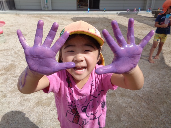 手や顔に付いた絵の具はタライで洗い流し、ぶどうジュースの出来上がり♡
