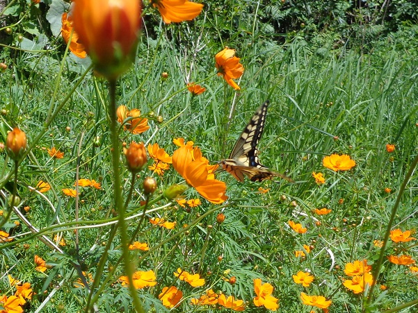 アゲハ蝶もコスモスのいい匂いに誘われてやってきました!!