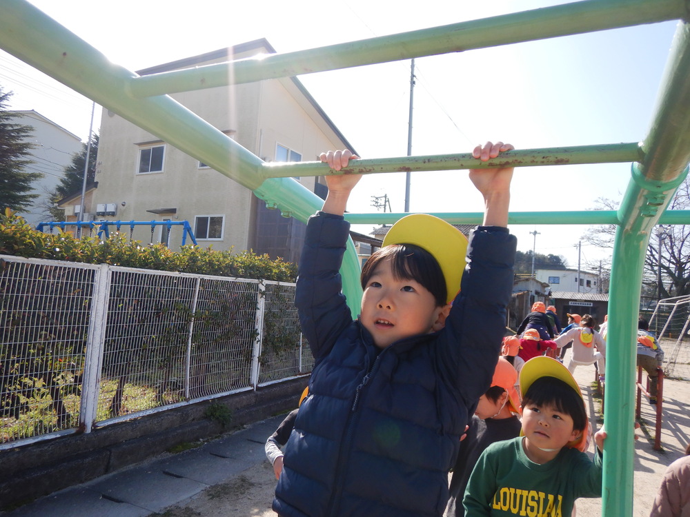 雲梯で遊びました。ぶら下がるのは簡単だけど、手を伸ばして前に進むのはちょっと難しい。
