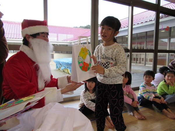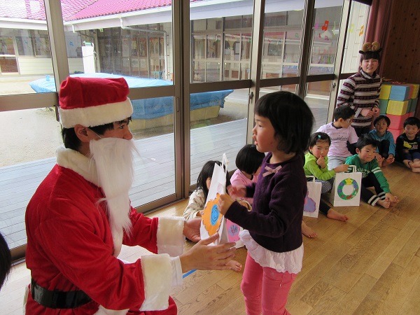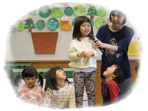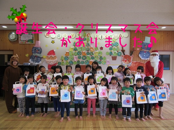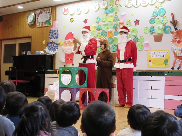 2017年12月20日 ドキドキわくわく!今日は楽しみにしていた・・・まずは誕生会からスタート!インタビューもばっちりでしたよ☆メダルをもらってにっこり☻そしていよいよサンタさんとトナカイさんの登場です。手品を見せてくれました。一緒にダンスもしましたよ■お待ちかねのプレゼントタイム!緊張しながらも「ありがとう」が言えました。楽しい一日になったね!