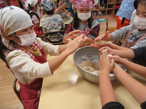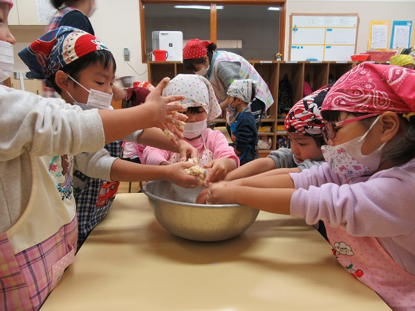 2017年12月22日 クリスマスクッキング♪今日は楽しみにしていたクッキングの日■ブラジルでクリスマスに食べられているケーキ「パネトーネ」を作りました!中に入れるレーズンに興味津々のひこうきさん...✨材料を入れてみんなでこねこね~♪「なんか手にべたべた引っ付くなあ~...」「かたまってきた♡」初めてのパネトーネ作り、とっても楽しそうな子ども達でした☺おやつの時間にみんなで美味しく食べましたよ♡