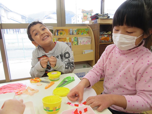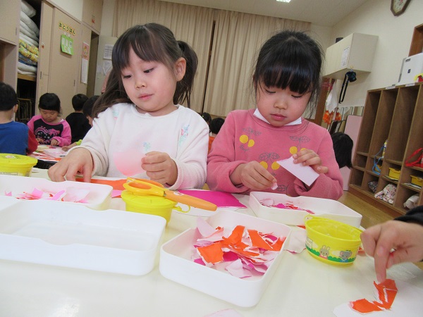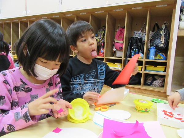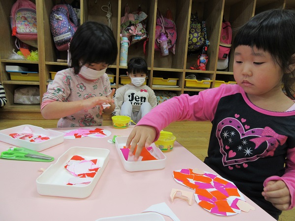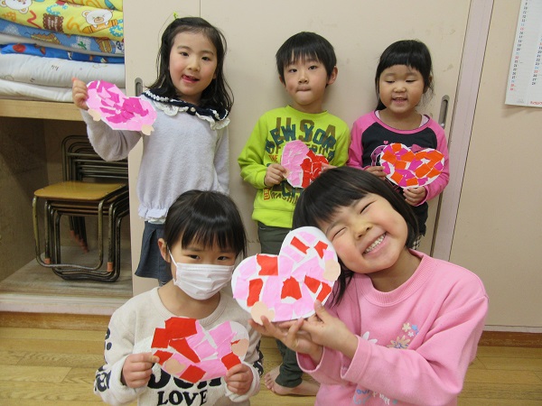 2018年02月13日 ハートのちぎり絵!明日はバレンタイン✨小さくちぎった折り紙でハートを作りました♡根気のいる細かい作業にとっても集中していたひこうきさん!カラフルでかわいいハートの形ができました✨乾かしたら顔を描いて完成です☺お部屋に飾るのでぜひ覗いてみてください♪午睡後、避難訓練(地震)を行いました。